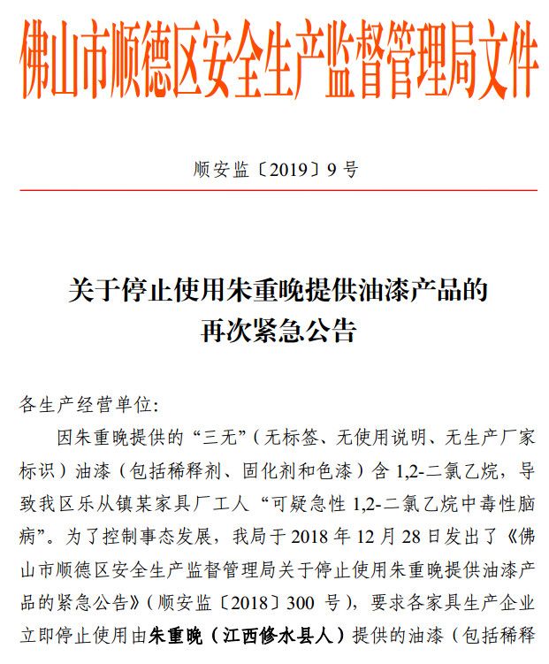据了解,近日,佛山市顺德区安全生产监督管理局发布《关于停止使用朱重晚提供油漆产品的再次紧急公告》称因,朱某某提供的“三无”(无标签、无使用说明、无生产厂家标识)油漆(包括稀释剂、固化剂和色漆)含1,2-二氯乙烷,导致我区乐从镇某家具厂工人“可疑急性1,2-二氯乙烷中毒性脑病”。通知发出后,经查,仍有部分家具厂使用朱某某提供的油漆,这些家具厂已全部被我局封停。