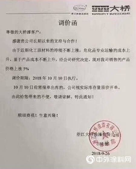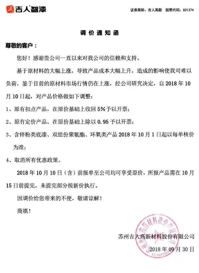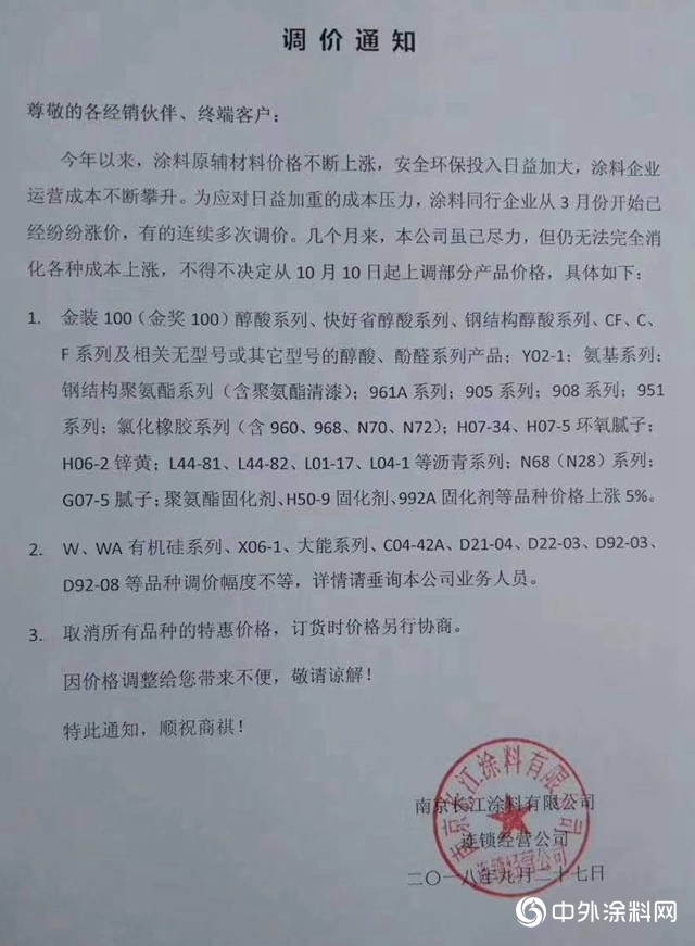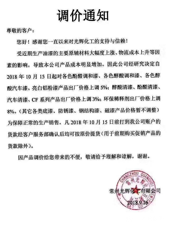 调价通知称,受近期生产油漆的主要原辅材料大幅度上涨、物流成本上升等因素的影响,导致公司产品成本明显增加。经公司研究决定,自2018年10月15日期,对各色酚醛调和漆、各色醇酸调和漆、各色醇酸汽车漆、亮白铝粉漆产品出厂价格上调5%;醇酸清漆、酚醛清漆、汽车清漆、CF系列产品出厂及噶尔上调3%;环保稀释剂出厂价格上调8%。(其他各类底漆、防锈漆、钢结构漆、磁漆产品价格暂不调整)。
